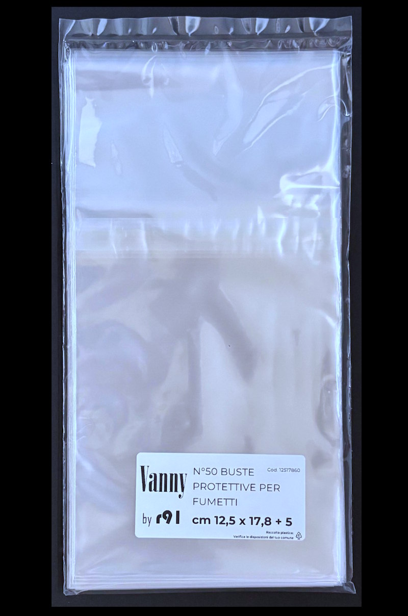 Buste per fumetti 125×178 mm “Vanny by r91” in polipropilene neutro da 60 MICRON, auto-chiudenti con striscia adesiva e patella. Prodotto Italiano