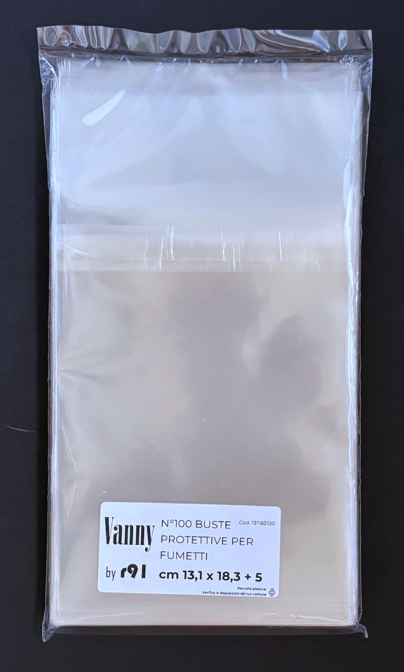 Buste per fumetti 131×183 mm “Vanny by r91” in polipropilene neutro da 60 MICRON, auto-chiudenti con striscia adesiva e patella. Prodotto Italiano