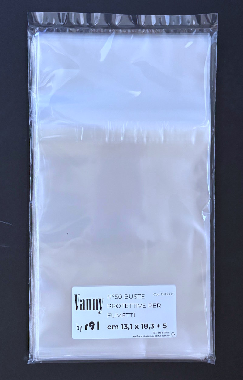 Buste per fumetti 131×183 mm “Vanny by r91” in polipropilene neutro da 60 MICRON, auto-chiudenti con striscia adesiva e patella. Prodotto Italiano