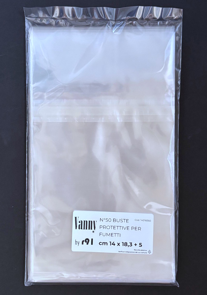 Buste per fumetti 140×183 mm “Vanny by r91” in polipropilene neutro da 60 MICRON, auto-chiudenti con striscia adesiva e patella. Prodotto Italiano