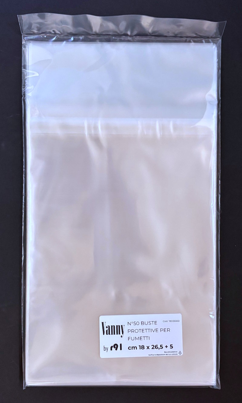 Buste per fumetti 180×265 mm “Vanny by r91” in polipropilene neutro da 60 MICRON, auto-chiudenti con striscia adesiva e patella. Prodotto Italiano