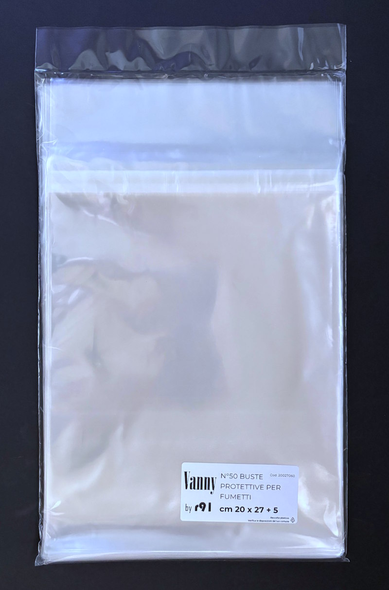 Buste per fumetti 200×270 mm “Vanny by r91” in polipropilene neutro da 60 MICRON, auto-chiudenti con striscia adesiva e patella. Prodotto Italiano