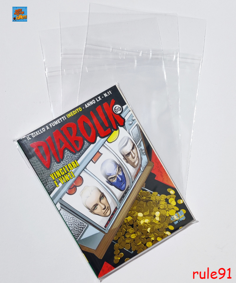Buste per fumetti Diabolik e Alan Ford 131×178 mm in polipropilene neutro da 60 MICRON, auto-chiudenti con striscia adesiva e patella. Prodotto Italiano