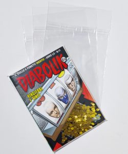 Buste per fumetti Diabolik e Alan Ford 131×178 mm in polipropilene neutro da 60 MICRON, auto-chiudenti con striscia adesiva e patella.