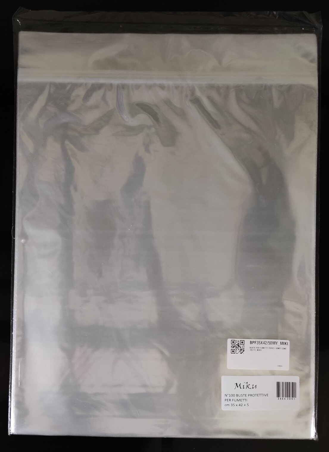 Buste per fumetti tipo Grandi Formati in polipropilene neutro da 50 MICRON auto-chiudenti con striscia adesiva e patella (350×420 mm). Prodotto Italiano