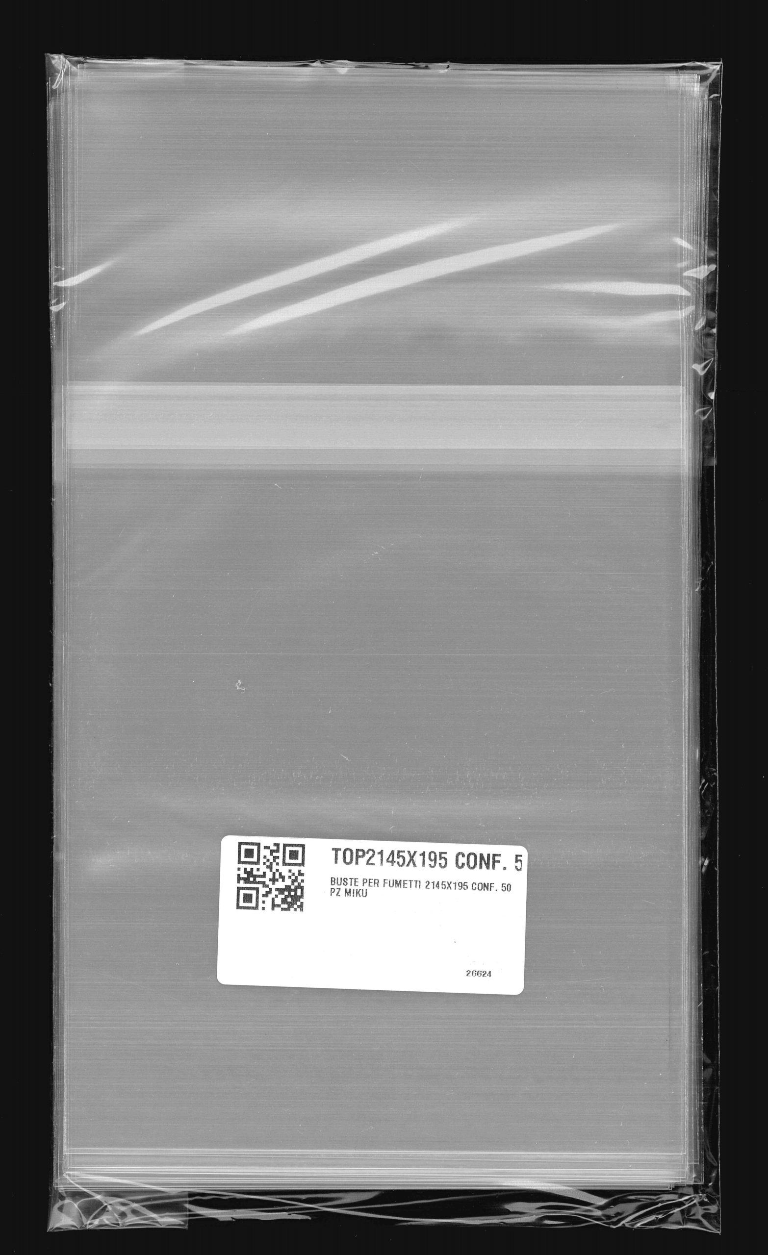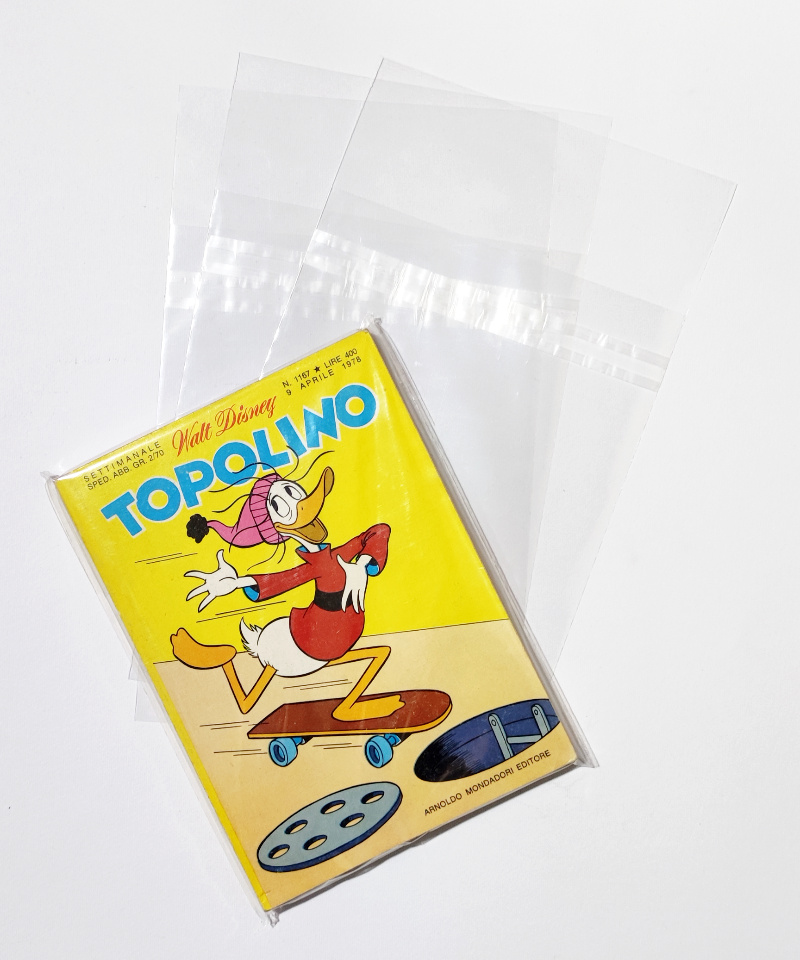 Buste per Topolino (dal n.605 al n.1805) in polipropilene neutro da 60 MICRON, auto-chiudenti con striscia adesiva e patella (145×195 mm). Prodotto Italiano