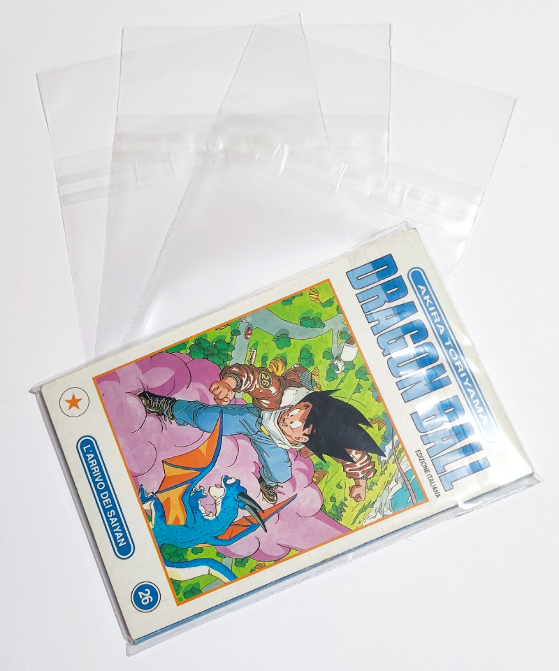 Buste protettive per fumetti 125×178 mm e Manga post estate 2012 in polipropilene neutro 50 MICRON auto-chiudenti con striscia adesiva e patella.