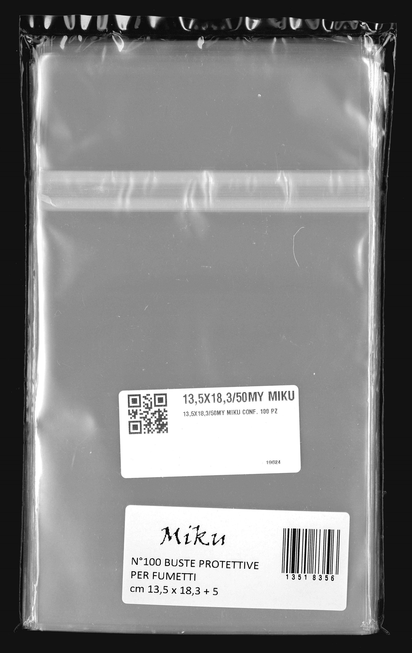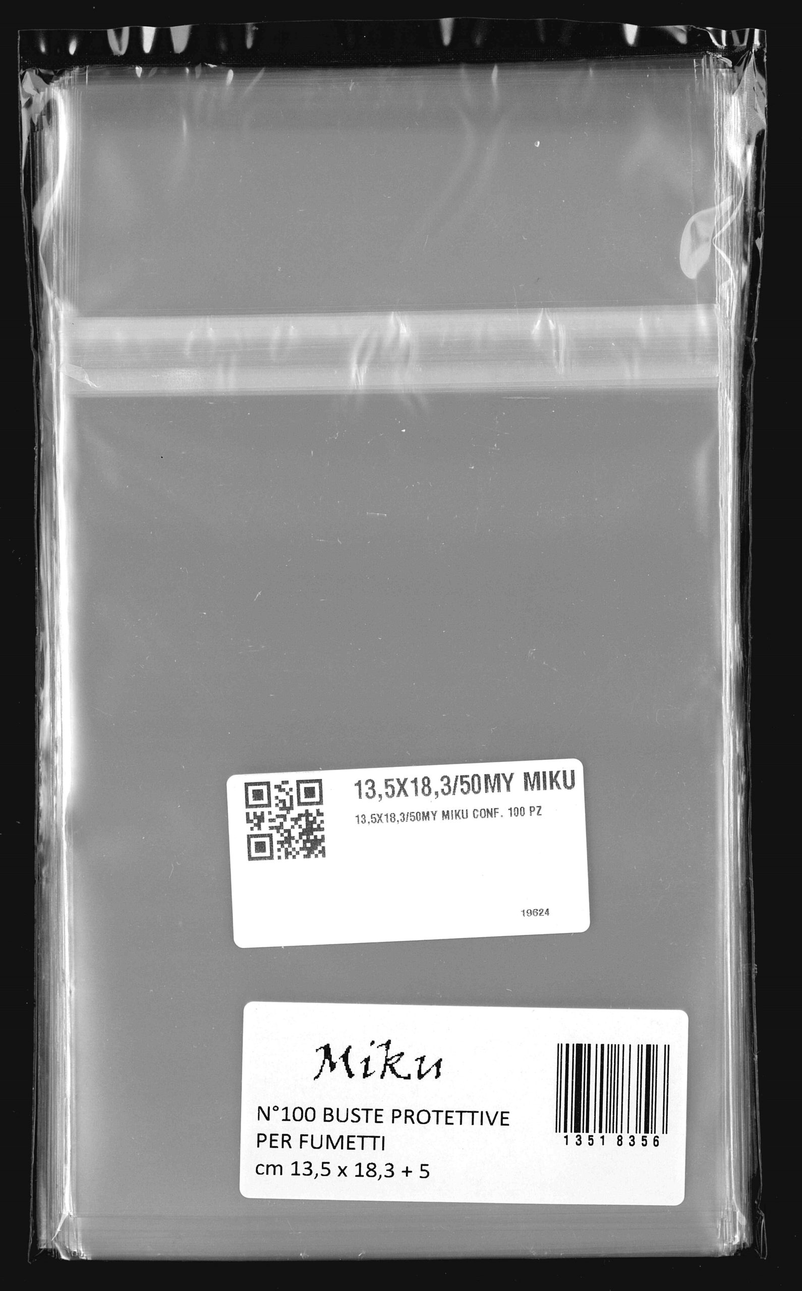 Buste protettive per fumetti 135×183 mm in polipropilene neutro da 50 MICRON auto-chiudenti con striscia adesiva e patella. Prodotto Italiano