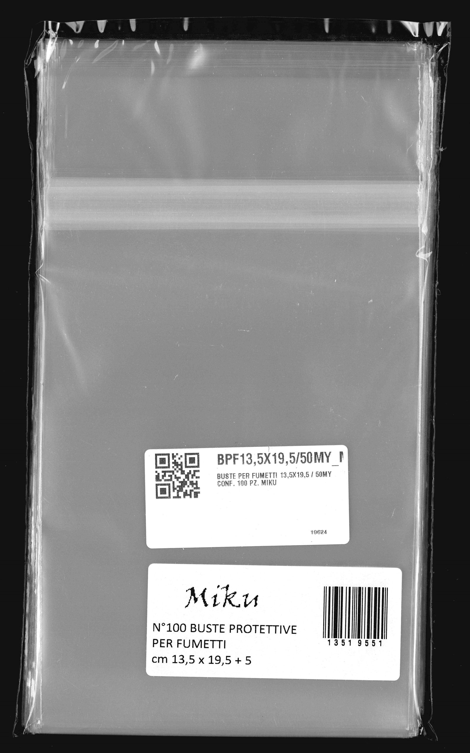 Buste protettive per fumetti 135×195 mm in polipropilene neutro da 50 MICRON, auto-chiudenti con striscia adesiva e patella. Prodotto Italiano