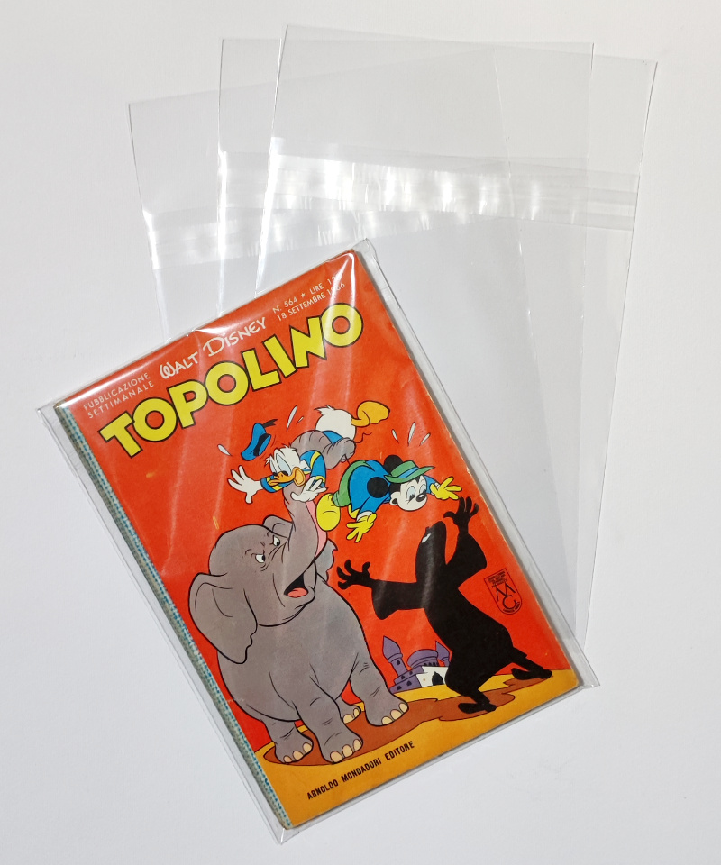Buste protettive per fumetti 135×195 mm in polipropilene neutro da 50 MICRON, auto-chiudenti con striscia adesiva e patella. Misura perfetta per fumetti serie Topolino dal n.75 al n.604.