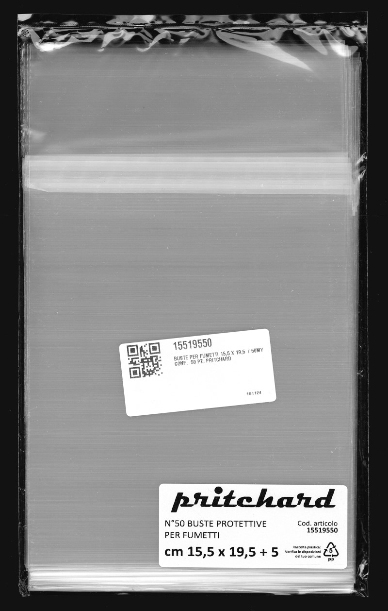 Buste protettive per fumetti 155×195 mm in polipropilene neutro da 50 MICRON, auto-chiudenti con striscia adesiva e patella. Prodotto Italiano