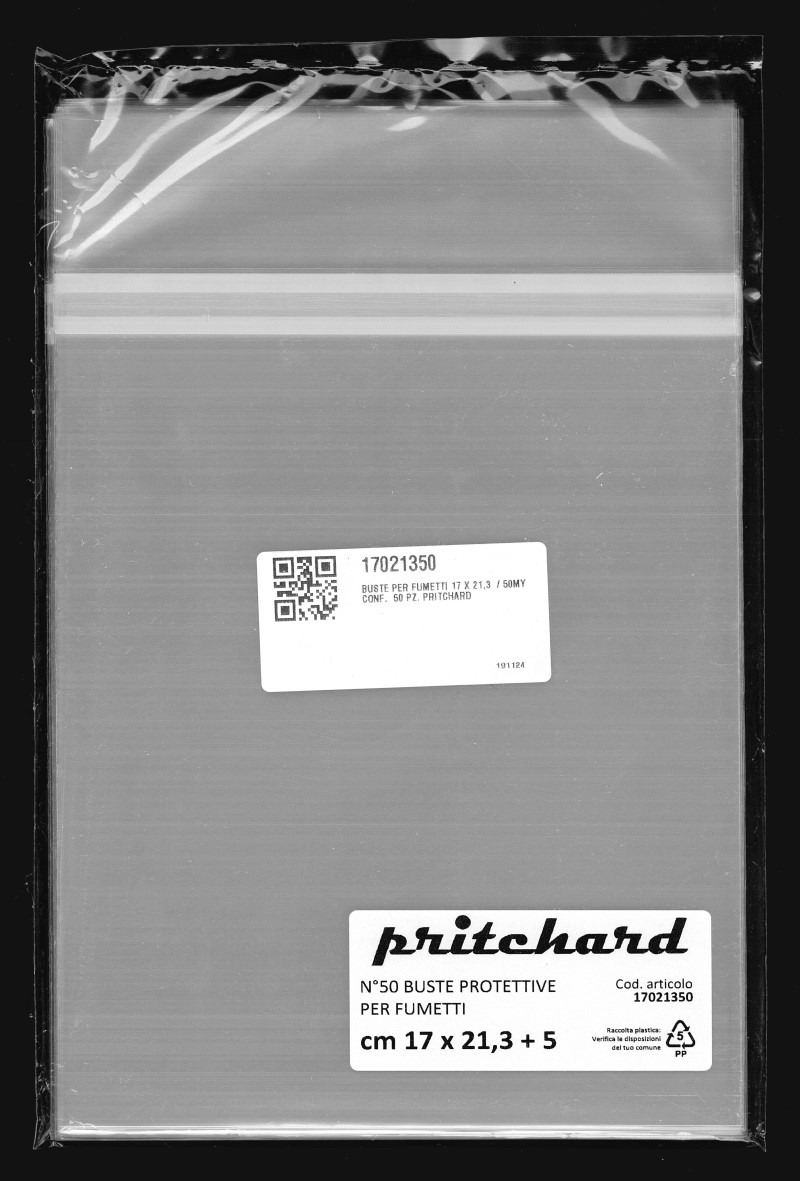 Buste protettive per fumetti 170×213 mm in polipropilene neutro da 50 MICRON, auto-chiudenti con striscia adesiva e patella. Prodotto Italiano