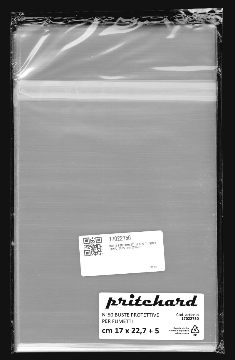 Buste protettive per fumetti 170×227 mm in polipropilene neutro da 50 MICRON, auto-chiudenti con striscia adesiva e patella. Prodotto Italiano