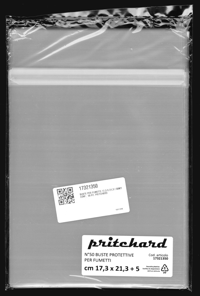 Buste protettive per fumetti 173×213 mm in polipropilene neutro da 50 MICRON, auto-chiudenti con striscia adesiva e patella. Prodotto Italiano