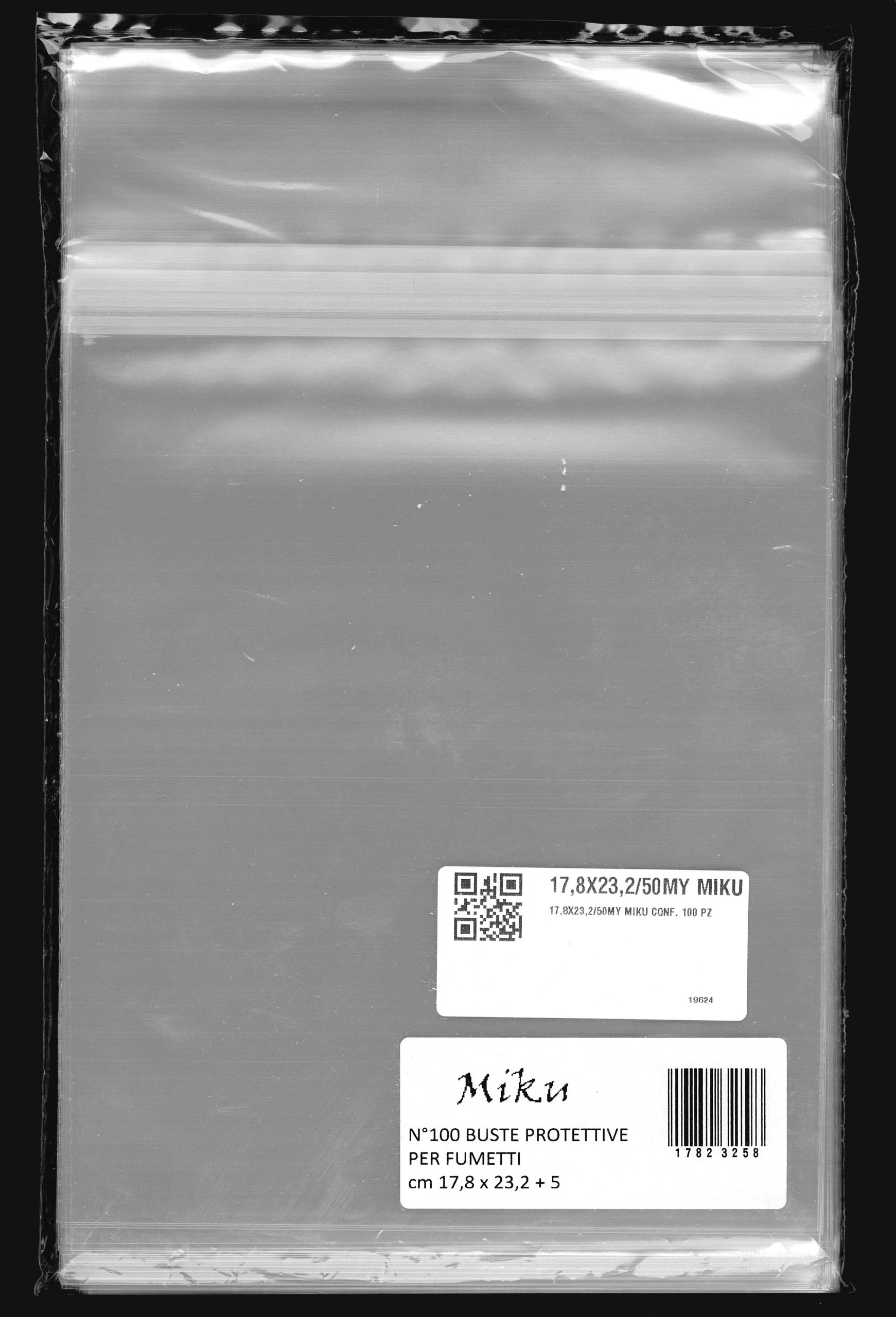 Buste protettive per fumetti 178×232 mm in polipropilene neutro da 50 MICRON auto-chiudenti con striscia adesiva e patella. Prodotto Italiano