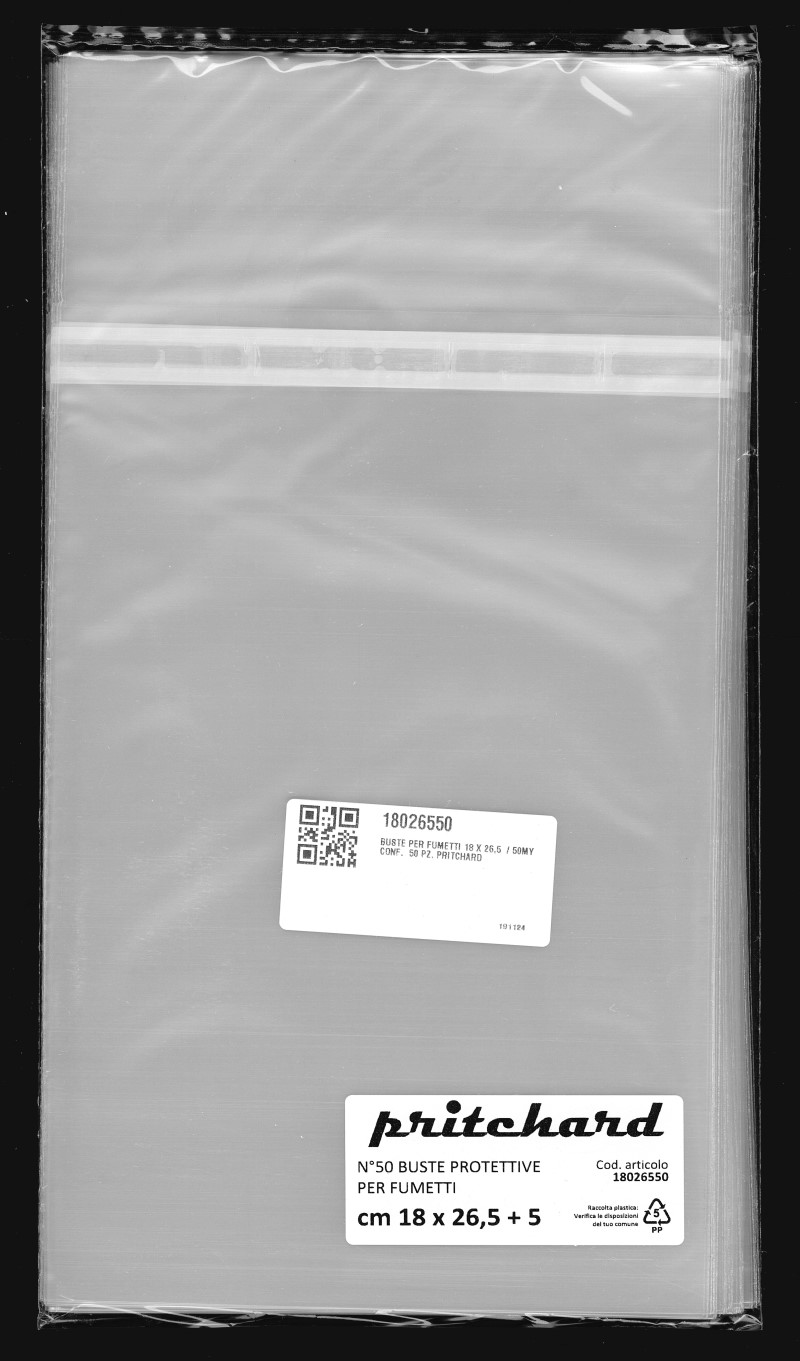 Buste protettive per fumetti 180×265 mm in polipropilene neutro da 50 MICRON, auto-chiudenti con striscia adesiva e patella. Prodotto Italiano