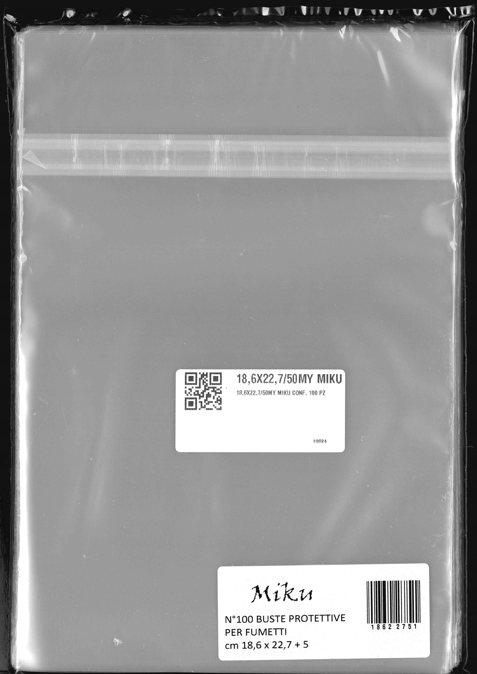Buste protettive per fumetti 186×227 mm in polipropilene neutro da 50 micron, auto-chiudenti con striscia adesiva e patella. Prodotto Italiano