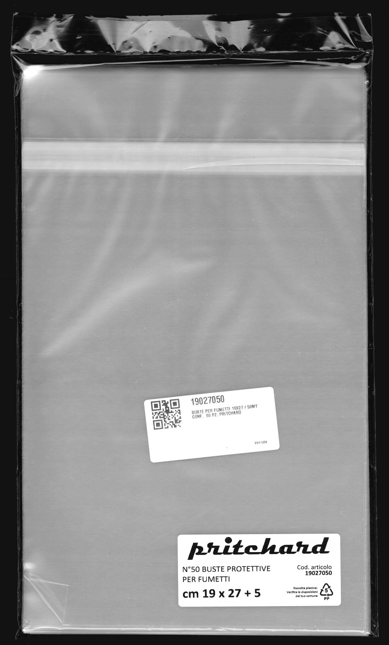 Buste protettive per fumetti 190×270 mm in polipropilene neutro da 50 MICRON, auto-chiudenti con striscia adesiva e patella. Prodotto Italiano