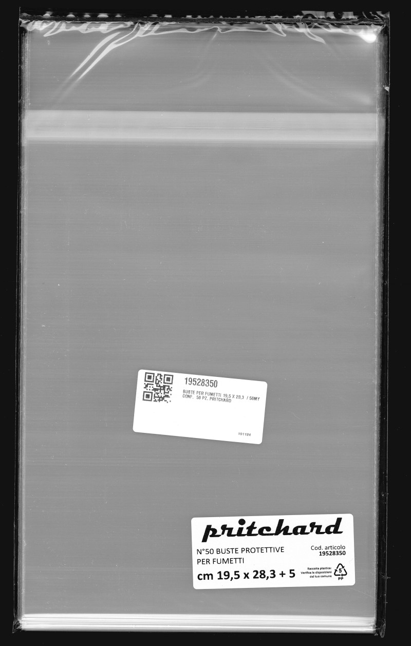Buste protettive per fumetti 195×283 mm in polipropilene neutro da 50 MICRON, auto-chiudenti con striscia adesiva e patella. Prodotto Italiano
