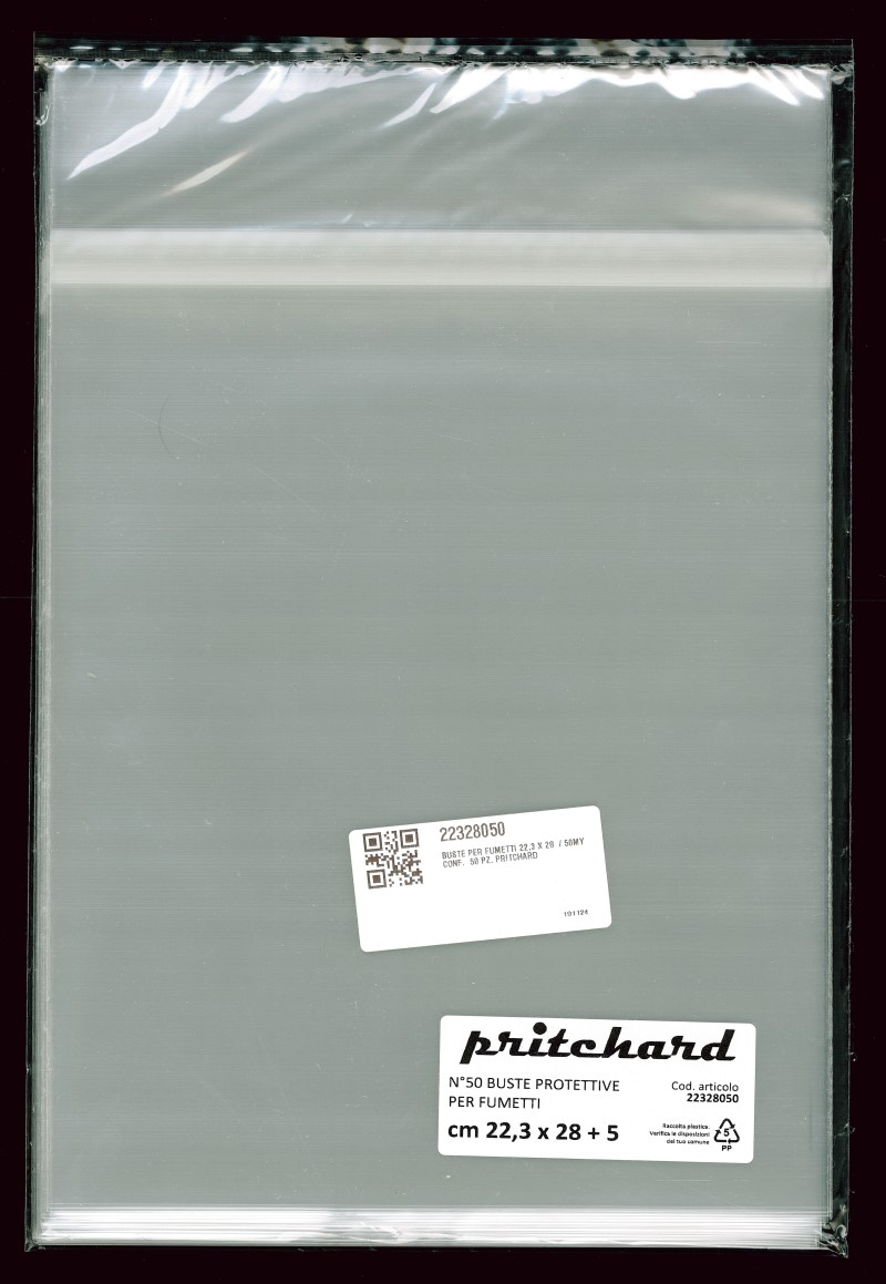 Buste protettive per fumetti 223×280 mm in polipropilene neutro da 50 MICRON, auto-chiudenti con striscia adesiva e patella. Prodotto Italiano