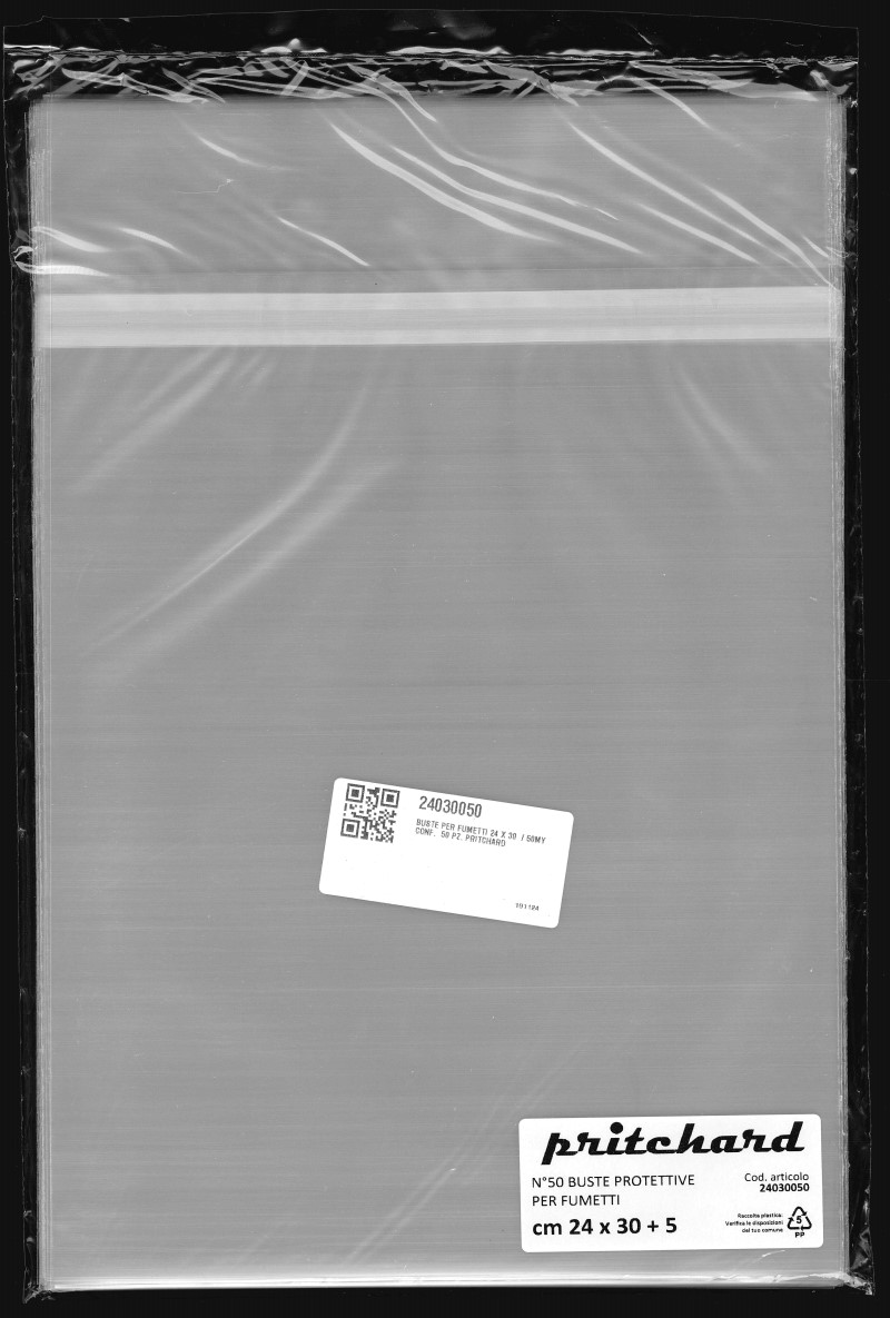 Buste protettive per fumetti 240×300 mm in polipropilene neutro da 50 MICRON, auto-chiudenti con striscia adesiva e patella. Prodotto Italiano
