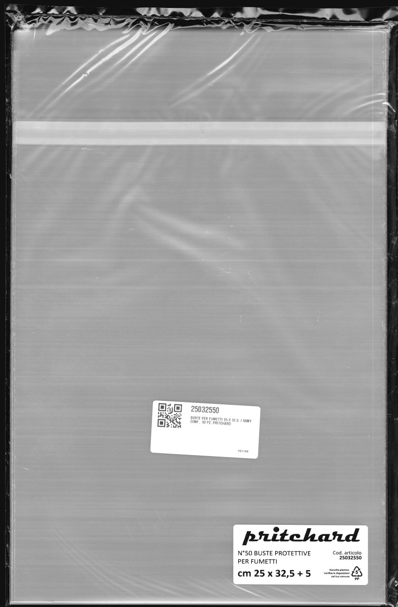 Buste protettive per fumetti 250×325 mm in polipropilene neutro da 50 MICRON, auto-chiudenti con striscia adesiva e patella. Prodotto Italiano