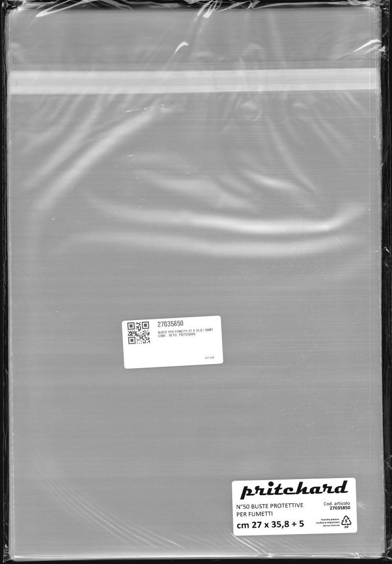 Buste protettive per fumetti 270×358 mm in polipropilene neutro da 50 MICRON, auto-chiudenti con striscia adesiva e patella. Prodotto Italiano
