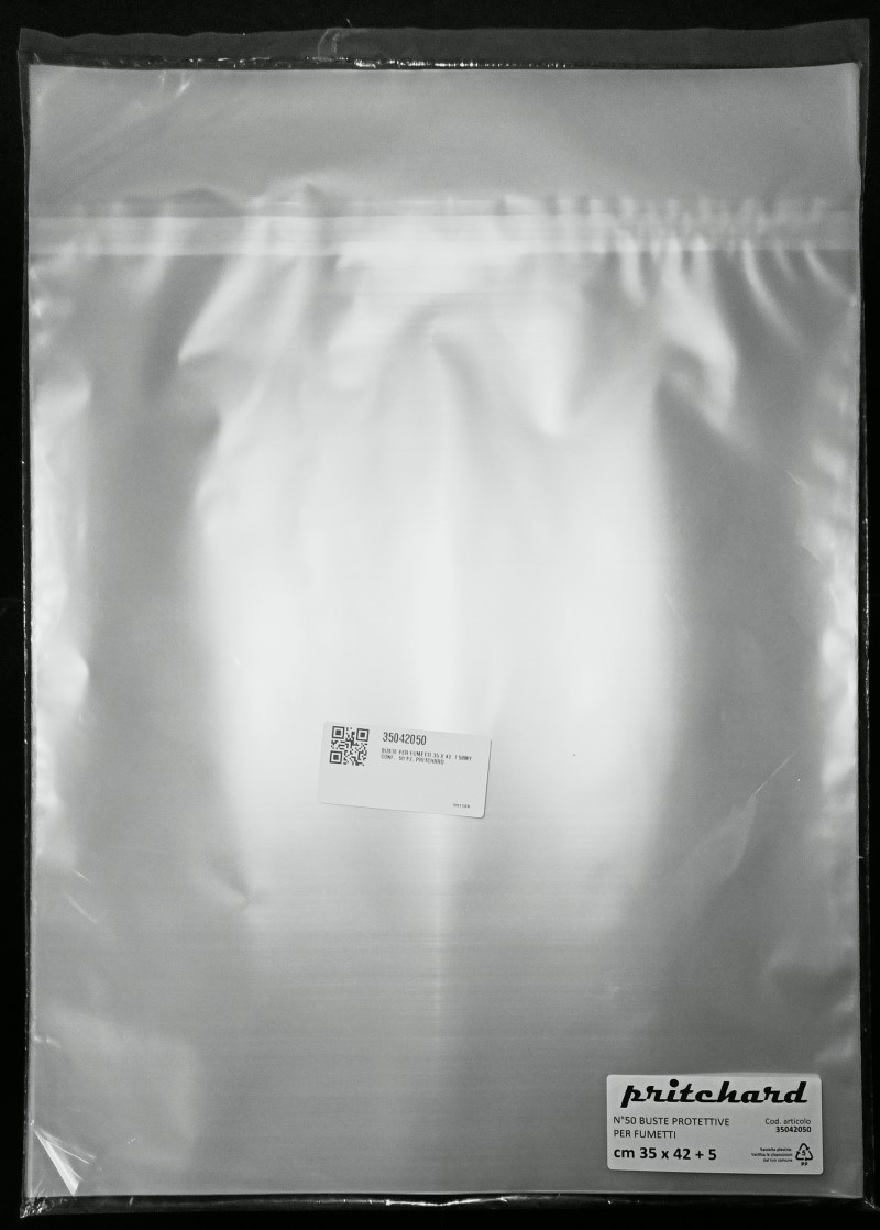 Buste protettive per fumetti 350×420 mm in polipropilene neutro da 50 MICRON, auto-chiudenti con striscia adesiva e patella. Prodotto Italiano