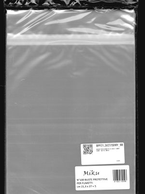 Buste protettive per fumetti 195×270 mm in polipropilene neutro da 50 MICRON, auto-chiudenti con striscia adesiva e patella. Prodotto Italiano